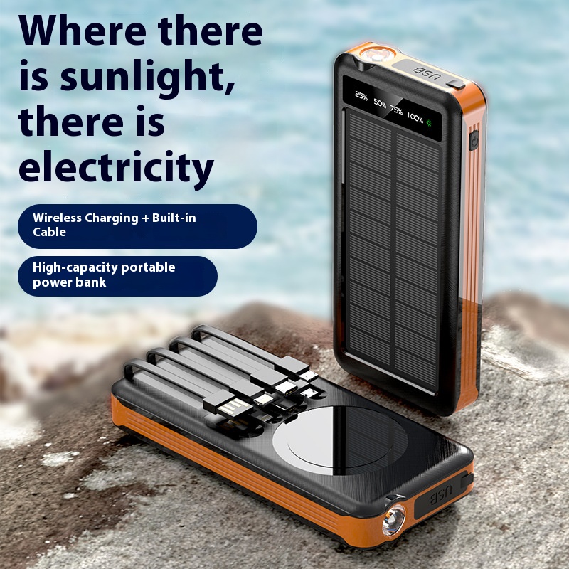 The Solar Power Bank Comes with a Built-in Cable, a 10,000 Mah Wireless Charging Portable Waterproof Power Bank for Outdoor Use